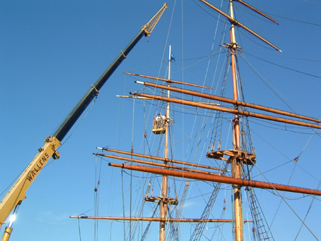 Här riggar vi till Briggen Gerdas rår i slutfasen av den stående riggen. Som du ser har Gerda både under och övermärsrår. Vi använder oss oftast mobilkranar vid sättning av mast och rår. |